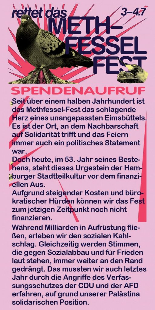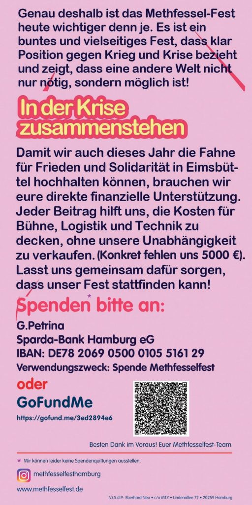2025 Ankündigung vor Anmeldungen Che Guevara • Clara Zetkin • Rosa Luxemburg • Karl Marx • Karl Liebknecht Es ist wieder soweit! Wir wollen wieder mit Vergnügen Position beziehen! am 11. und 12 Juli 2025 am 11. und 12. Juli 2025 auf dem Else-Rauch-Platz in Eimsbüttel auf demElse-Rauch-Platzin Eimsbüttel Seid dabei und meldet Euch an: Initiativen Kultur und Musik Kinderfest Helfende Wir freuen uns auf Euch! Eure Methfesselfestgruppe PS: Gruppen, die rassistisches, rechtes, homophobes, antisemitisches und fremdenfeindliches Gedankengut verbreiten wollen, finden bei uns keinen Platz!